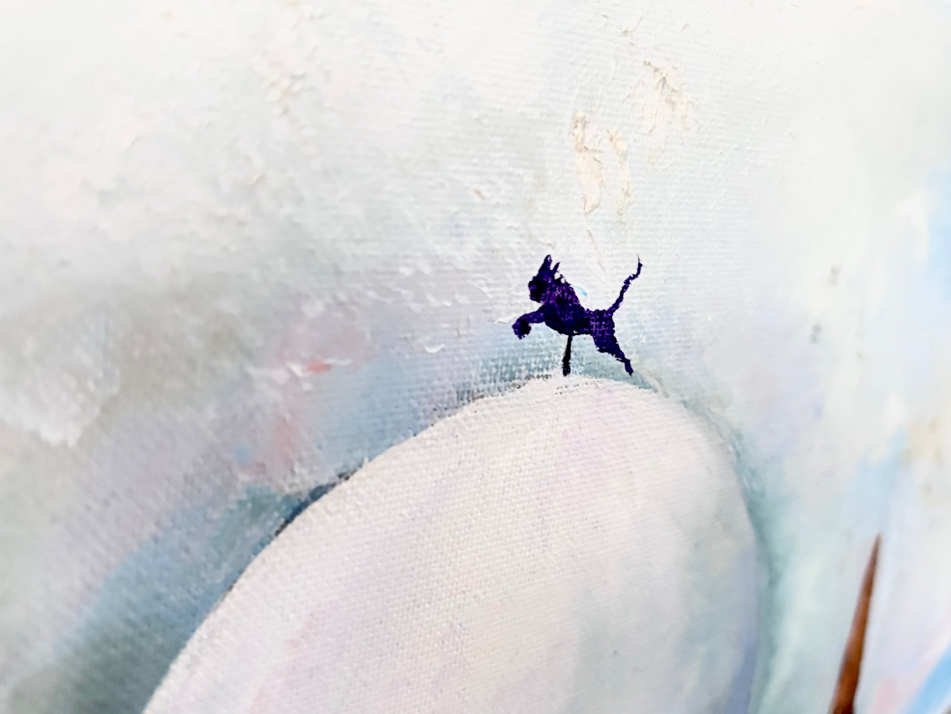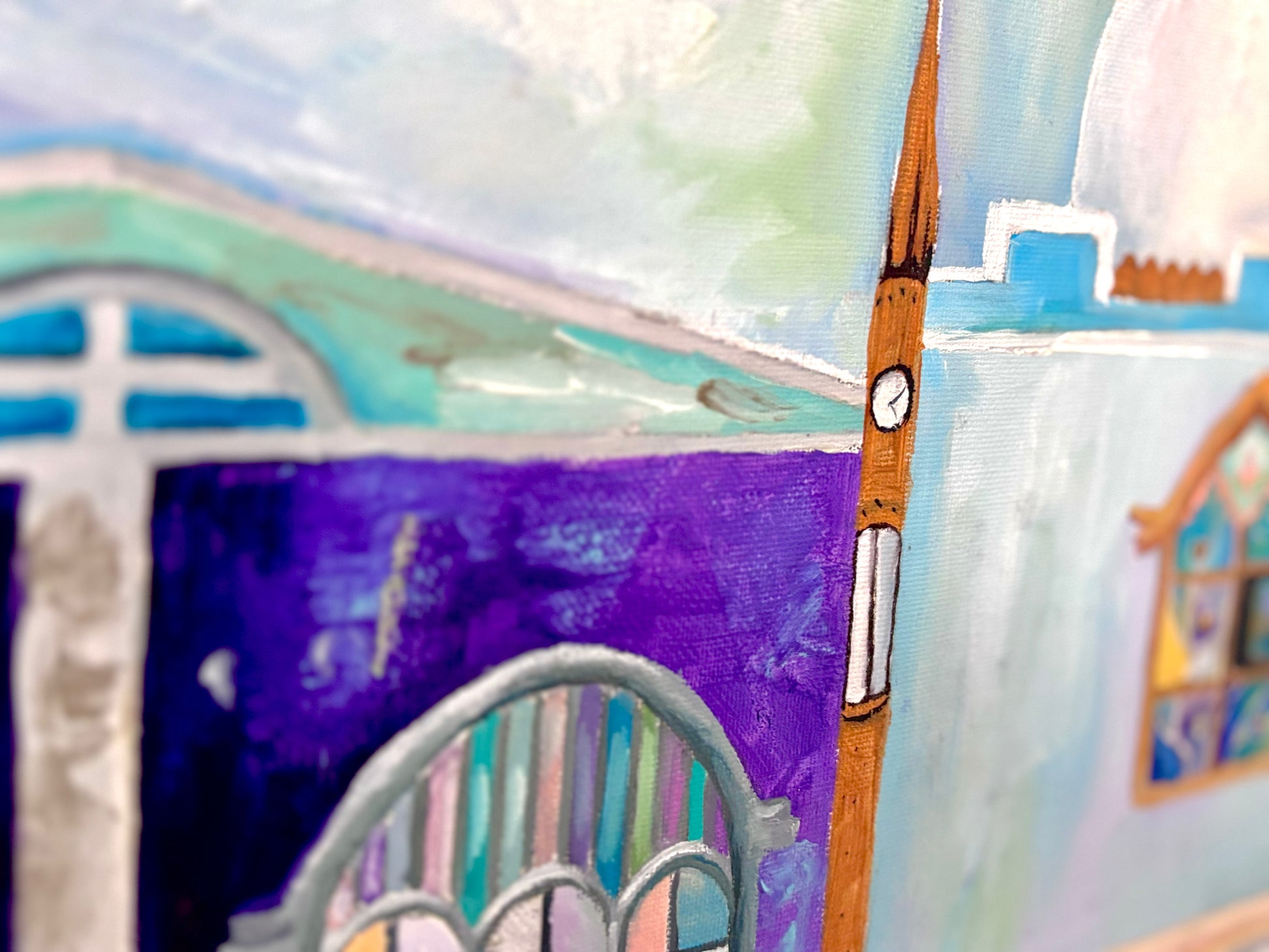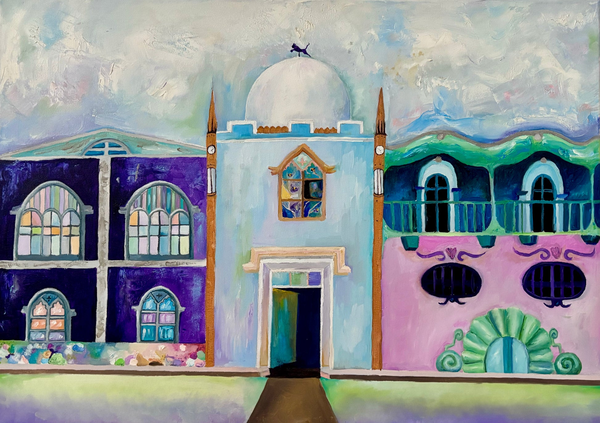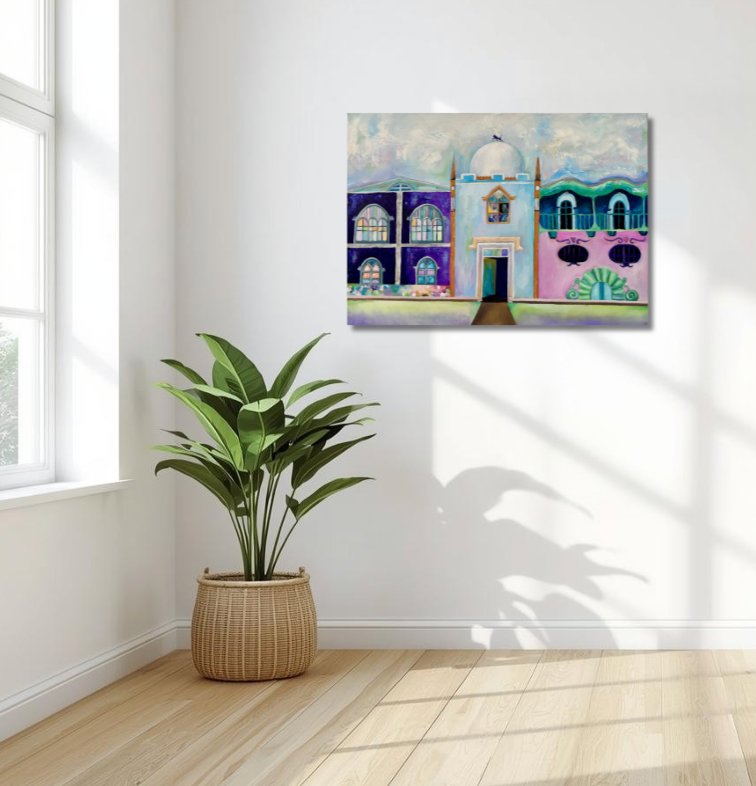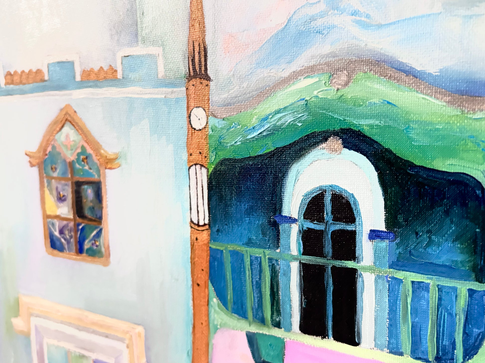 Lucrare originală realizată manual pe pânză de bumbac întinsă pe șasiu de lemn, folosind tehnica uleiului pe pânză. „Acasă” este o compoziție luminoasă și delicată, care surprinde o clădire cu aer poetic, redată într-o paletă pastelată și armonioasă. Atmosfera ușor whimsical evocă sentimentul de liniște, familiaritate și visare, transformând ideea de „acasă” într-un spațiu al siguranței, al imaginației și al bucuriei simple.